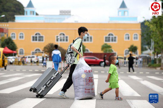 8月22日,在贵州省黔东南苗族侗族自治州丹寨县第二中学,初一年级新生(左)在弟弟的陪伴下前往报到处。