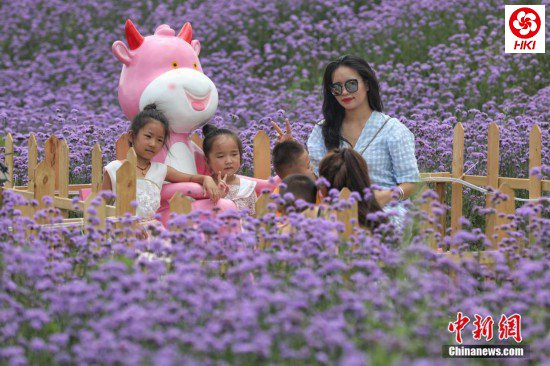 8月11日,游客在马鞭草紫色花海中拍照。近日,贵阳市花溪区高坡乡境内种植的马鞭草竞相绽放,进入盛花期,吸引游客前来观赏。 中新社记者 瞿宏伦 摄