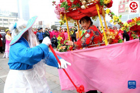 2月13日,民间艺人在江苏省连云港市连云区街头表演“划旱船”。