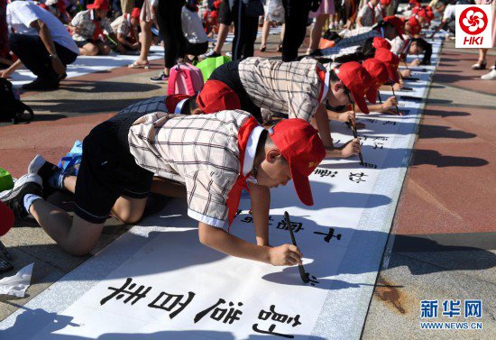 当日,“八桂书风 童心向党”——南宁市百名儿童百米书法长卷现场书写活动在广西南宁市举行,240余名学生现场共同书写百米书法长卷。