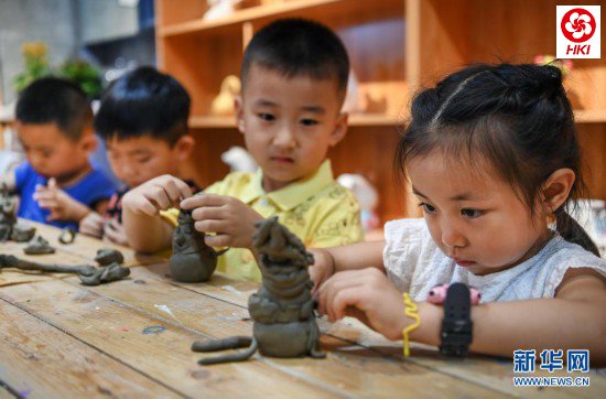 7月15日,几名小朋友在“慢·拾光”小站的泥塑室学习泥塑制作。