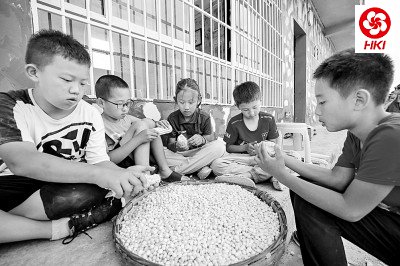 2021年7月26日,学生在贵州省黔西市雨朵镇平坝村青少年体验式教育基地给玉米脱粒。罗兴祥摄/光明图片