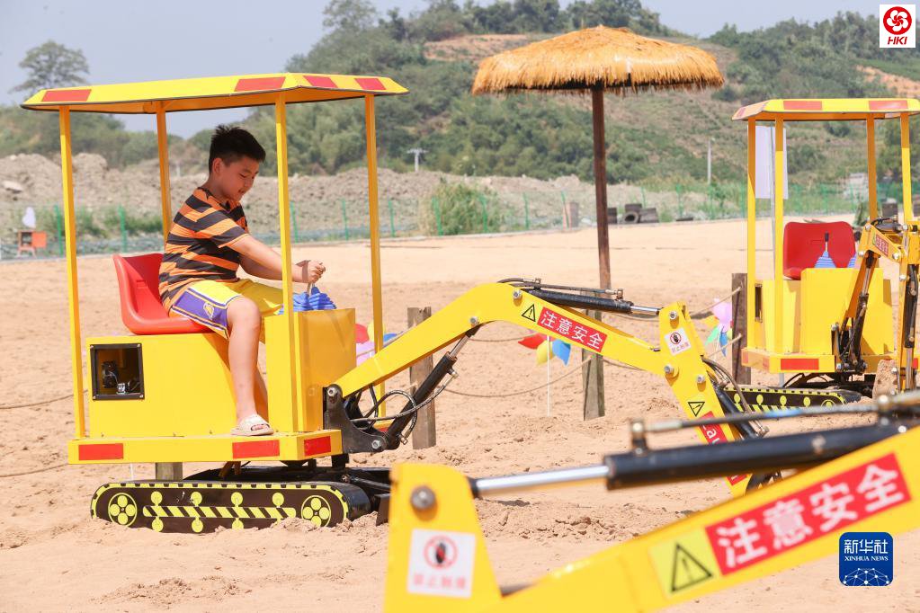 10月2日,小朋友在浙江省湖州市德清县乾元镇城北村矿坑沙滩游玩。