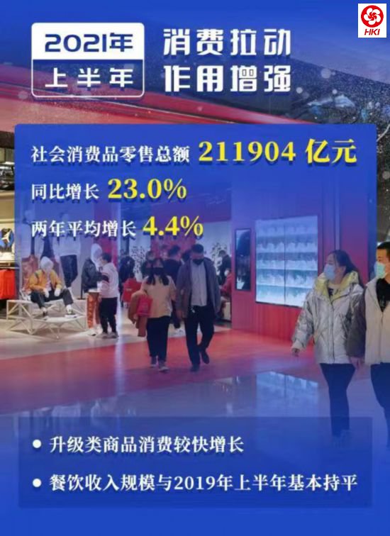 虽然2020年消费增速为负增长,但今年以来这一指标持续回暖向好。上半年,社会消费品零售总额211904亿元,同比增长23.0%,两年平均增长4.4%。其中,一度受冲击严重的餐饮收入21712亿元,同比增长48.6%,规模与2019年上半年基本持平。