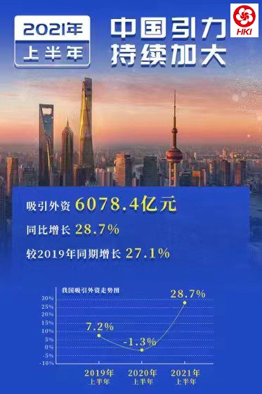 逆势上涨的外资彰显中国引力。2021年1月至6月,全国实际使用外资6078.4亿元,同比增长28.7%。高技术产业成为引资热点:实际使用外资同比增长39.4%,其中高技术服务业增长42.7%,高技术制造业增长29.2%。