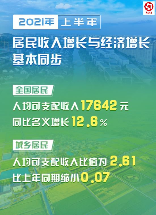 就业形势总体稳定带动工资性收入较快增长。上半年,全国居民人均可支配收入17642元,同比名义增长12.6%,两年平均增长7.4%;扣除价格因素同比实际增长12.0%,两年平均增长5.2%。值得一提的是,城乡居民人均收入比值2.61,比上年同期缩小0.07。
