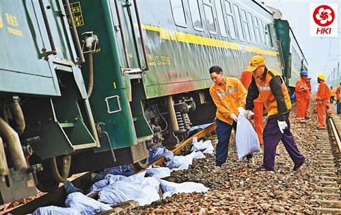 ▲7月21日,受河南特大暴雨影响,京广线郑州市境内部分区段于7月20日出现边坡溜坍险情,中铁郑州局集团干部职工对京广线水害地点路基进行紧急抢修。王 玮摄(中经视觉)