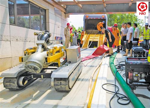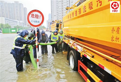 7月20日,河南郑州城管局工作人员出动大型清淤车辆疏通下水道。面对汛情,当地城管系统干部群众坚守岗位,奋力抢险。李新华摄(中经视觉)