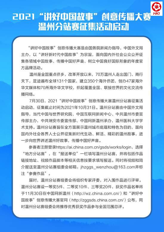 2021“讲好中国故事”创意传播大赛温州分站赛即日起全面启动作品征集,截止时间为2021年10月31日。温州分站赛旨在以全方面展示温州城市底蕴和特色为目的,面向国内外社会各界人士公开征集新时代生动、鲜活、精彩的温州故事,进一步向世界讲述温州好故事,传播中国好声音。