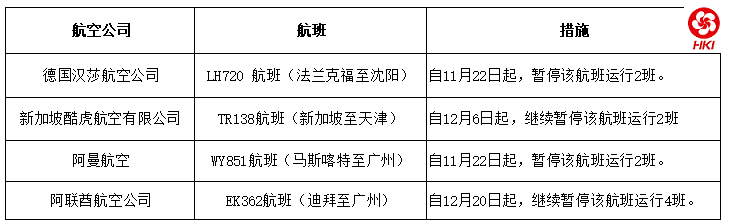 11月3日入境的德国汉莎航空公司LH720 航班(法兰克福至沈阳)确诊新冠肺炎旅客5例,自11月22日起,暂停该航班运行2班。11月3日入境的新加坡酷虎航空有限公司TR138航班(新加坡至天津)确诊新冠肺炎旅客7例,自12月6日起,继续暂停该航班运行2班;11月5日入境的阿曼航空WY851航班(马斯喀特至广州)确诊新冠肺炎旅客5例,自11月22日起,暂停该航班运行2班;11月6日入境的阿联酋航空公司EK362航班(迪拜至广州)确诊新冠肺炎旅客11例,自12月20日起,继续暂停该航班运行4班。上述熔断的航班量均不得用于其他航线。