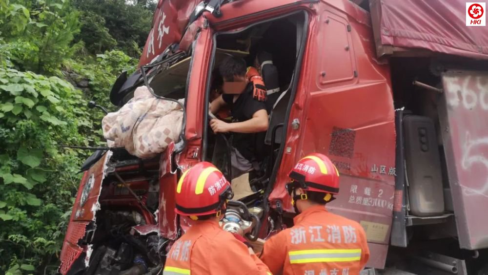8月11日16时59分,温州文成县大峃镇大发垟村一工地发生一起交通事故,一名司机被困。文成消防救援大队接警后立即赶赴现场救援,发现半挂车车头撞损严重,司机下身被死死卡在驾驶室,指战员立即使用液压剪扩钳对驾驶室车门进行剪切扩张。经过20分钟左右的紧张救援,将事故车辆驾驶员成功解救。