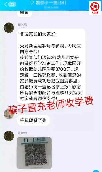 某家长反映,自己在儿子的班级群中收到一则收费信息,称受到新型冠状病毒影响,为响应国家号召,接教育局通知,本学期可扫二维码缴纳学费。