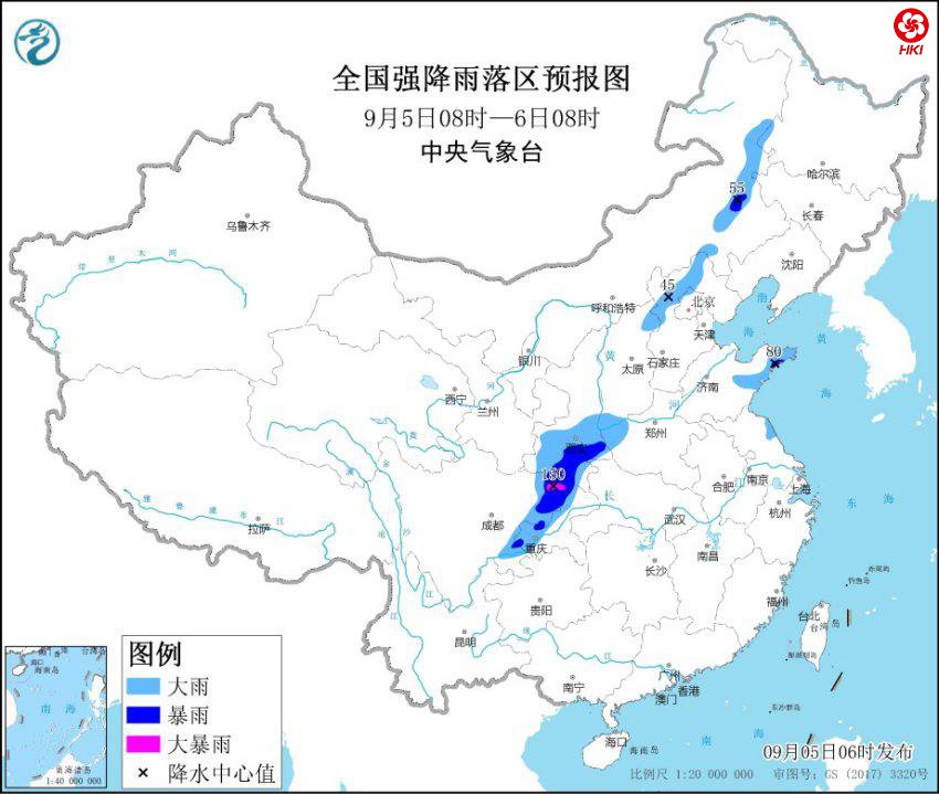 预计,9月5日08时至6日08时,陕西南部、四川盆地东北部、重庆西部、河南西部、山东半岛南部、江苏东部、河北北部、北京西北部、内蒙古东部等地部分地区有大到暴雨,其中,四川盆地东北部等地部分地区有大暴雨(100~150毫米)。上述部分地区伴有短时强降水(最大小时降雨量20~50毫米,局地可超过60毫米),局地有雷暴大风等强对流天气。
