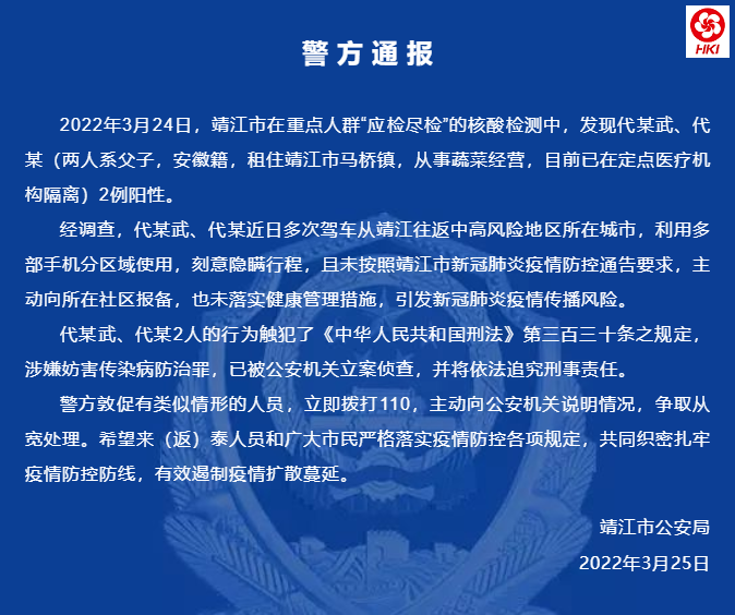 人民网北京3月25日电 (郝萍、吴楠)今天,江苏省靖江市公安局通报,租住靖江市马桥镇的父子二人利用多部手机分区域使用,刻意隐瞒行程,涉嫌妨害传染病防治罪,已被公安机关立案侦查。