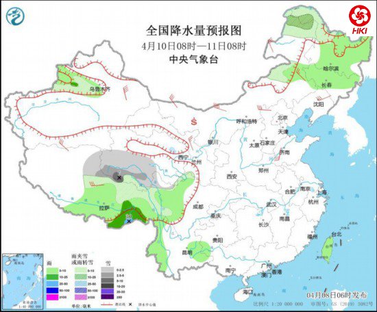 4月10日08时至11日08时,新疆沿天山地区、西藏北部、青海中南部、内蒙古东北部、黑龙江西北部等地部分地区有小到中雪或雨夹雪,其中,西藏北中部、青海南部等地部分地区有大雪(5~7毫米)。东北地区北部和中部、新疆伊犁河谷、西藏东部、云南西部、台湾岛等地部分地区有小到中雨,其中,西藏东南部局地有大雨(25~30毫米)。内蒙古、东北地区中南部、西藏北部、甘肃河西、华北北部、黄淮等地部分地区有4~6级风,内蒙古西北部、新疆东部等地部分地区有6~7级风(见图4)。内蒙古中西部等地的部分地区有扬沙或浮尘。