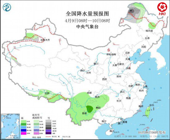 4月8日08时至9日08时,新疆北疆北部、西藏东北部、内蒙古东北部、黑龙江北部等地部分地区有小雪或雨夹雪,其中,北疆北部山区局地有大雪(5~9毫米)。东北地区东部、新疆北疆北部和沿天山地区、西藏东南部、四川南部、重庆西部、云南西部和北中部、贵州中西部、台湾岛等地部分地区有小到中雨,其中,西藏东南部、云南西北部等地局地有大雨(25~40毫米)。内蒙古、东北地区中东部、黄淮等地部分地区有4~6级风,新疆沿天山地区和东部等地部分地区有6~7级风,西藏北部部分地区有7~8级风(见图2)。内蒙古西部等地的部分地区有扬沙或浮尘。
