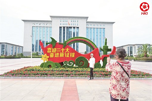 9月30日,在鹤城区行政中心广场,一组主题为“喜迎二十大 奋进新征程”的仿真绿雕,吸引不少市民前来拍照留影。