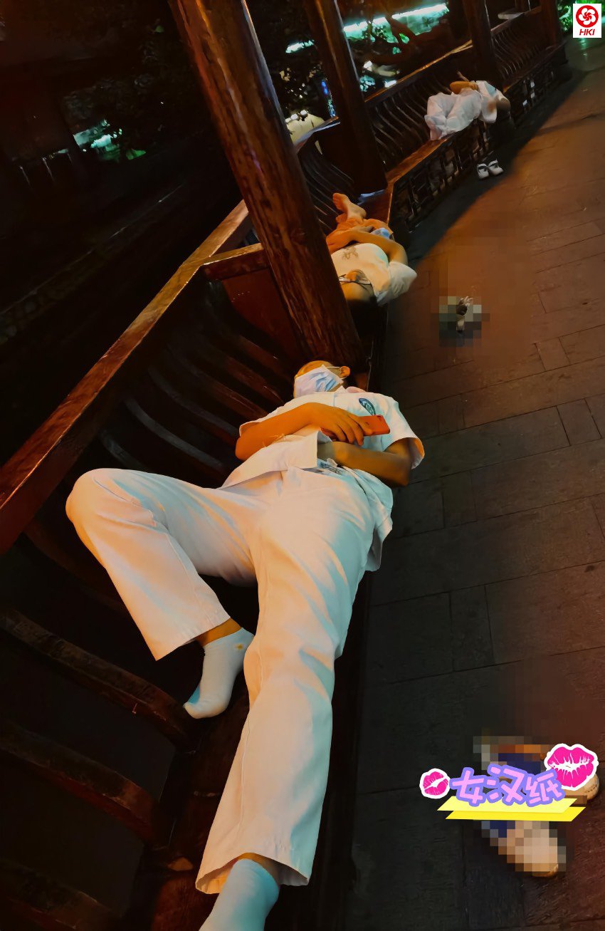一直到凌晨12点,采样工作还在进行。这个时间点,工作量稍有减少,部分工作人员赶紧抓紧时间休息,储存体力,之后还要去换下夜里值守的同事。他们说:“如果你看到这样一群女孩子,在广场座椅上、角落里不顾形象地席地而躺,请谅解。她们实在是太困了!”
