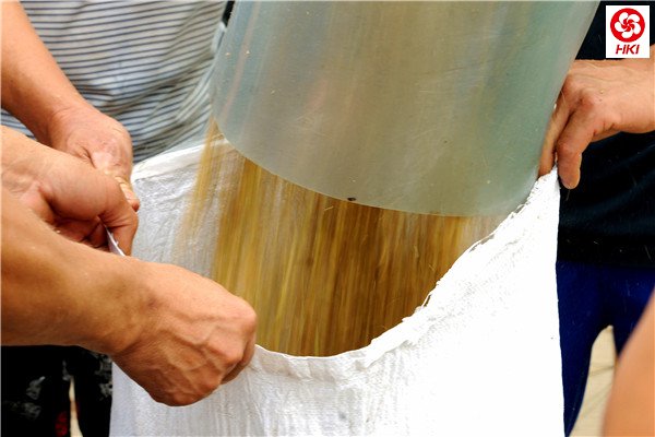 9月1日,在中江县辑庆镇联丰村验收现场,村民正在将杂交水稻装袋