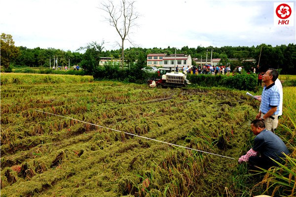 9月1日,在中江县辑庆镇联丰村验收现场,收割机正在收割杂交水稻