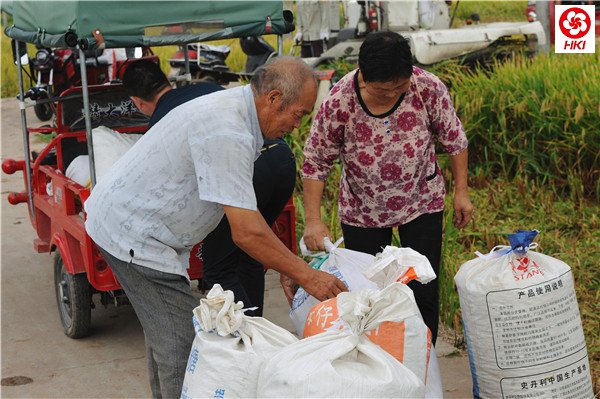 9月1日,在中江县辑庆镇联丰村验收现场,村民将杂交水稻装袋运回家