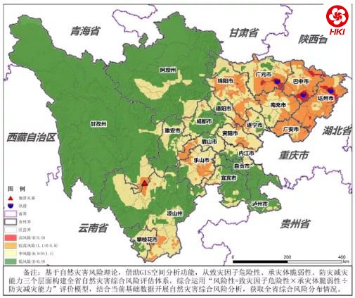 达州、巴中、广安、南充局部、广元大部、绵阳局部、德阳东南部、资阳局部、眉山西部、乐山局部、凉山局部、甘孜局部等地区自然灾害综合风险等级较高,主要致灾因子为洪涝与地质灾害。
