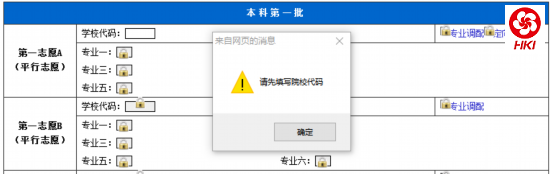 若所输入的学校代码和专业代码不存在,或者虽然存在该学校和专业代码,但该学校专业并不在考生当前所填写的志愿批次招生,则系统会提示如下: