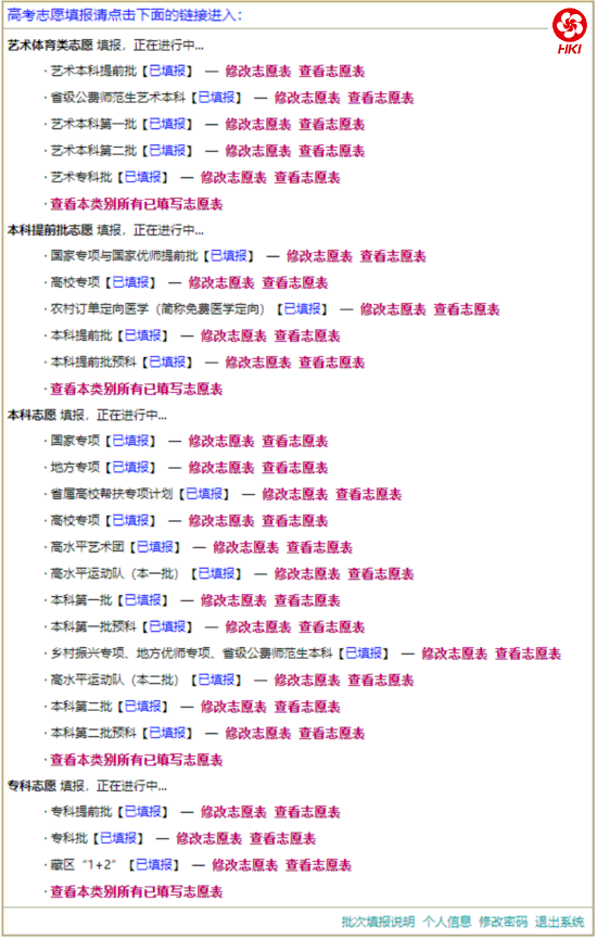 当某志愿类别尚未截止填报,且考生已经填写了该类别志愿表时,可以进行的操作有“修改志愿表”和“查看志愿表”,此时志愿类别选择页面如下图所示: