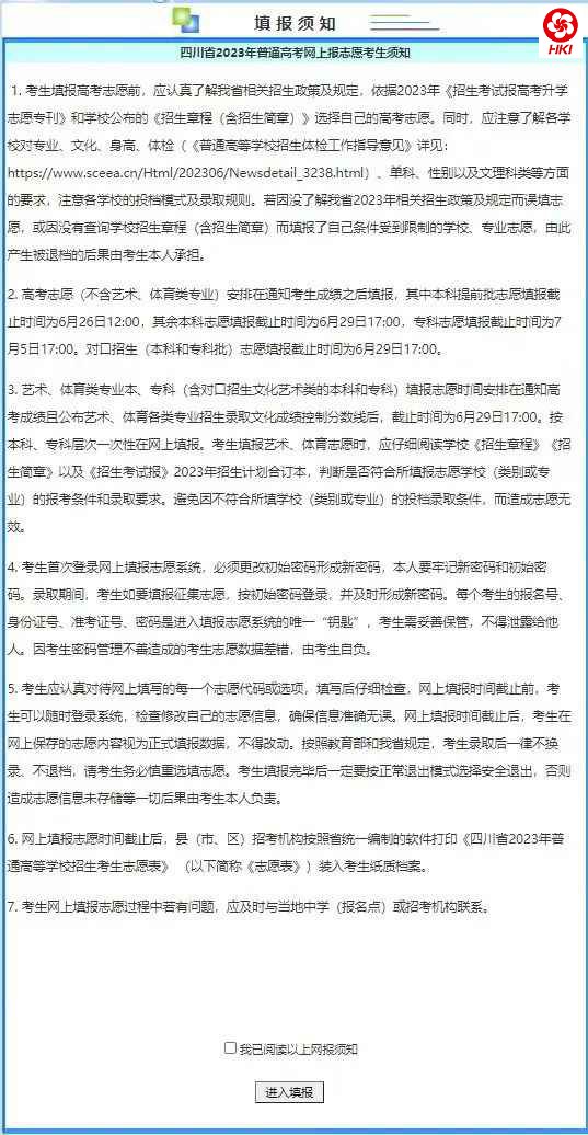 考生在每次登录网上填报志愿系统时将会进入“考生须知”页面,首次修改密码后也会转入此页面,如下图所示: