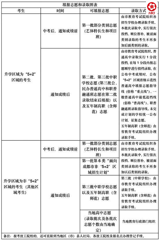 完成“5+2”区域部分普通高中“面向成都市非‘5+2’区域招生计划”、中职志愿以及五年制高职(含师范)志愿,以及按当地要求填报当地高中学校志愿。