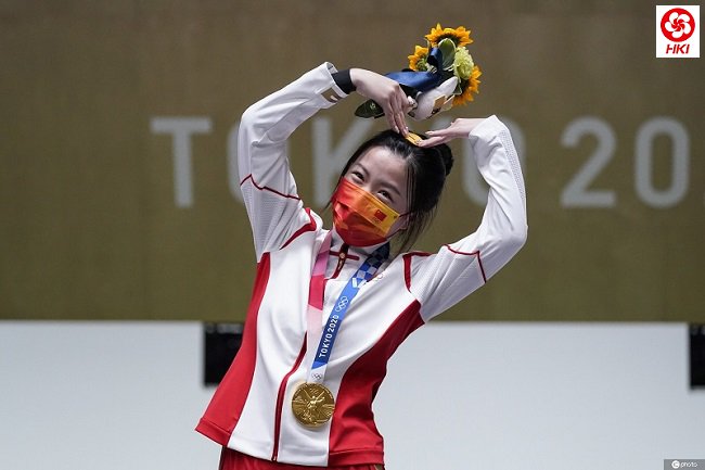 杨倩为中国代表团夺下首金后,在领奖台上“比心”。IC photo供图,请勿转载