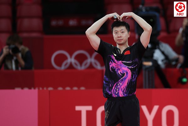 马龙夺得男单冠军后,“比心”庆祝胜利。人民日报报道团 崔萌摄