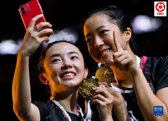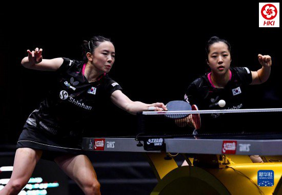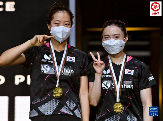 当日,在卡塔尔首都多哈进行2021年乒乓球亚锦赛女子双打决赛中,韩国组合田志希/申裕斌以3比1战胜中国香港组合杜凯琹/李皓睛,夺得冠军。新华社发(尼库摄)