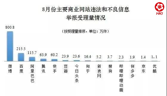 在全国主要网站受理的举报中,微博、百度、阿里巴巴、腾讯、快手、豆瓣、今日头条、知乎、新浪网、搜狗、哔哩哔哩动画、拼多多、京东、优酷等主要商业网站受理量占73.8%,达1337.2万件。