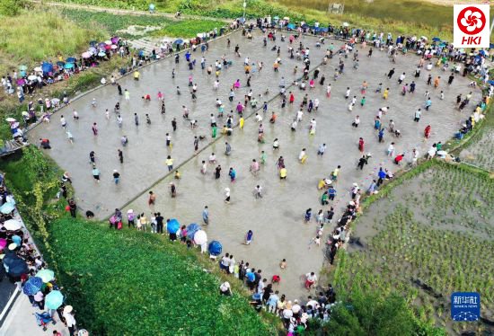 10月2日,在贵州省剑河县太拥镇昂英村,游客和村民参加抓鱼比赛(无人机照片)。