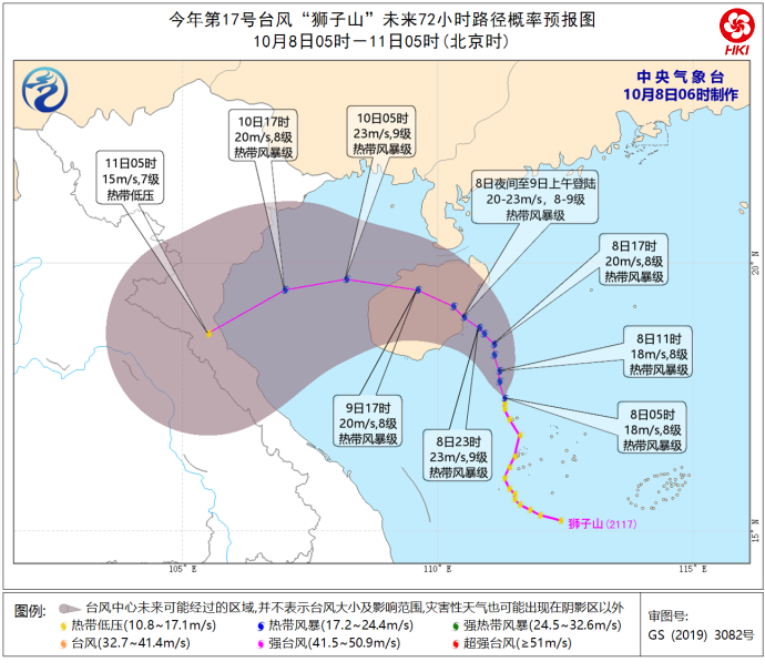 人民网北京10月8日电 (记者李楠桦)据中央气象台消息,中央气象台今晨发布台风蓝色预警,今年第17号台风“狮子山”于今晨生成,其中心距离海南省万宁市175公里,中心附近最大风力有8级。受其影响,未来24小时,我国南海大部海域及华南沿海将有6-7级的大风天气,海南、广东等地将有大到暴雨,局地大暴雨。