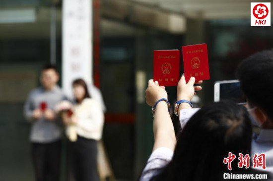 5月20日上午,北京市海淀区婚姻登记处外领证自拍的新人。 富田 摄