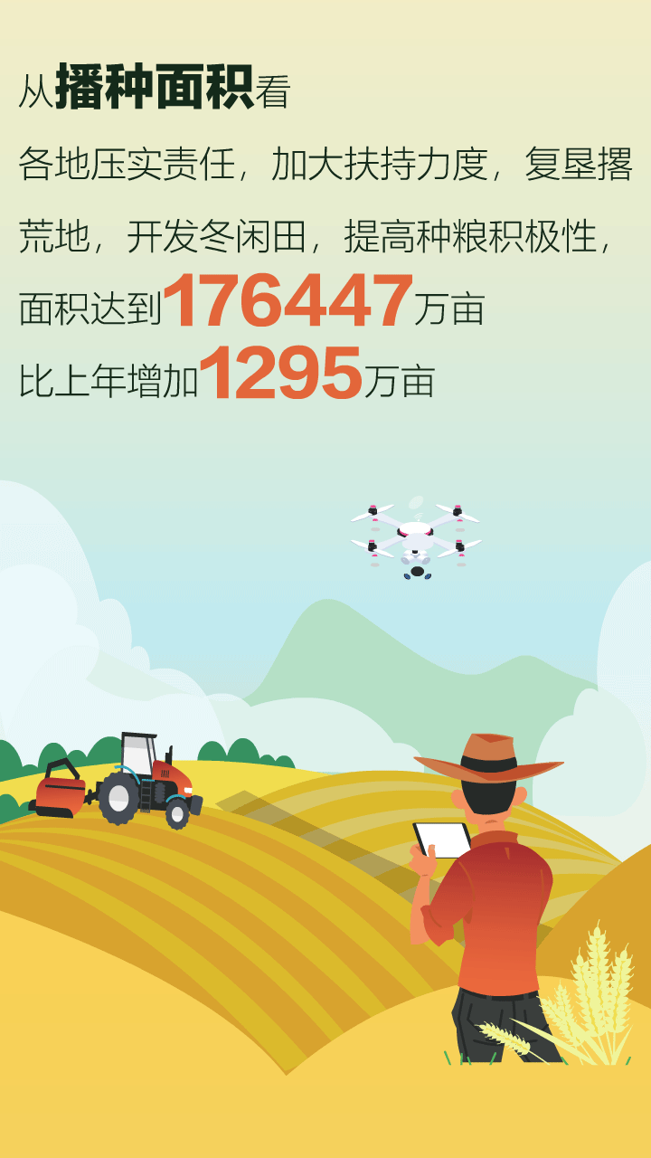 粮食播种面积增加1295万亩,增长0.7%。粮食单产增加4.8公斤,增长1.2%。粮食总产量增加267亿斤,增长2.0%。