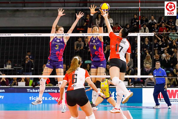 朱婷(4号)与贝丽恩拦网。图片来源:欧联杯官网