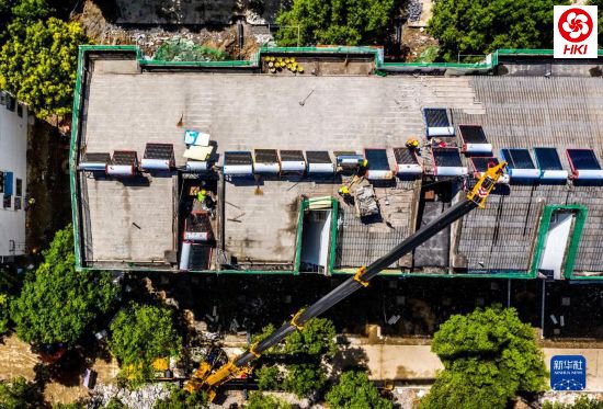8月25日,工人在合肥市瑶海区一老旧小区改造升级现场施工(无人机照片)。