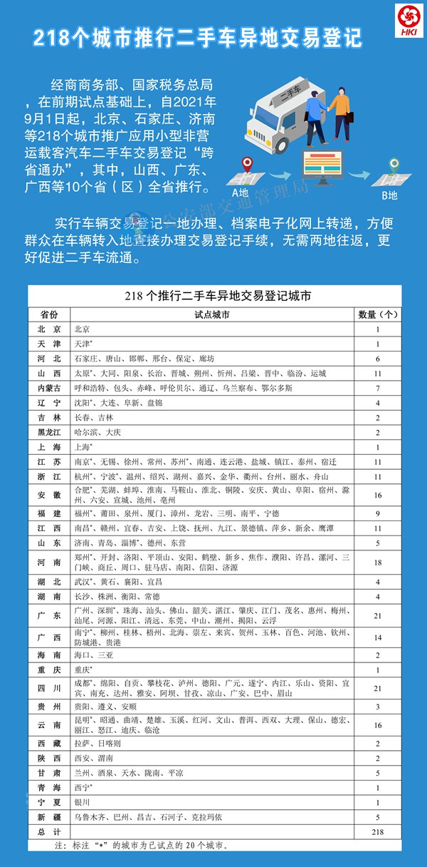 据了解,6月1日起,二手车交易登记“跨省通办”已在天津、太原、沈阳、上海等20个城市试点推行。9月1日起,在北京、石家庄、济南、泉州等218个城市推行,其中山西、广东、广西等10个省(区)全省推行。今年底前,全国将全面推行。