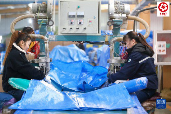 11月24日,青岛市即墨区龙山街道一家企业工人在生产出口到海外的防雨布产品。