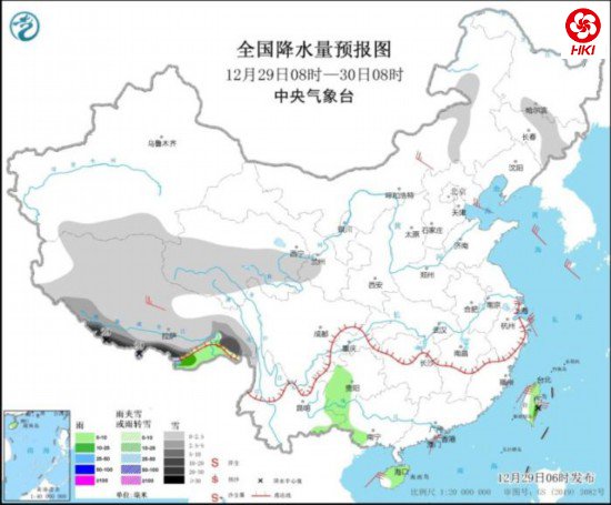 12月29日8时至30日8时,新疆南疆盆地、西藏大部、青海中南部、内蒙古东部、吉林东部等地部分地区有小到中雪或雨夹雪,其中,西藏南部部分地区有大到暴雪,局地大暴雪(20~29毫米)。西藏南部、贵州西部、海南岛、台湾岛东部等地部分地区有小到中雨,其中,西藏南部部分地区有大雨。西藏中部、内蒙古中部等地部分地区有4~5级风。