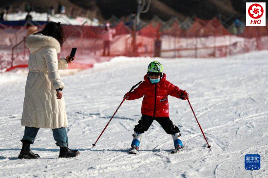 2月4日,小朋友在甘肃白银一家滑雪场练习滑雪。
