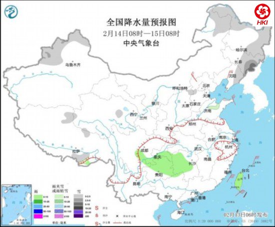 全国降水量预报图(2月14日8时-15日8时)