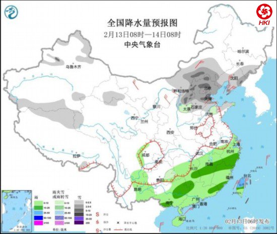 全国降水量预报图(2月13日8时-14日8时)