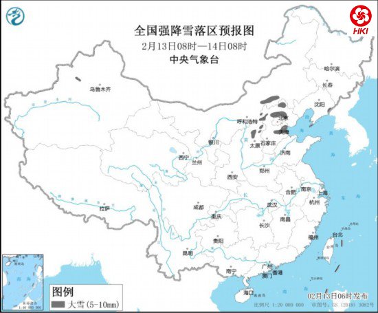 中新网2月13日电 据中央气象台网站消息,2月13日8时至14日8时,内蒙古中部偏南、山西北部、河北中北部、北京北部、天津南部、辽宁东部和南部、新疆沿天山地区等地部分地区有大雪。