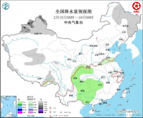 2月15日8时至16日8时,内蒙古东北部、黑龙江大部、吉林东部、新疆北部、西藏东部等地部分地区有小到中雪,其中,新疆北疆北部和伊犁河谷等地部分地区有大到暴雪(10~15毫米)。陕西南部、湖北西部、湖南大部、四川盆地大部、贵州大部、重庆南部、广西大部等地部分地区有小雨。内蒙古中部、辽宁东部等地部分地区有4~5级风。