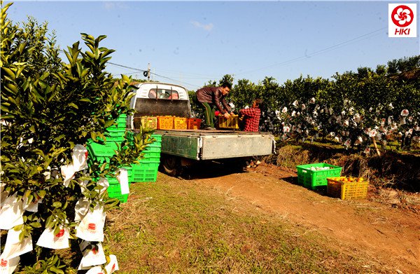 玉兴镇黄甜悬家庭农场工人正在将爱媛装车
