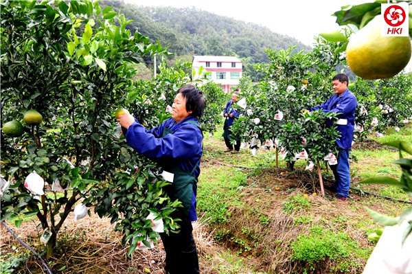 玉兴镇黄甜悬家庭农场工人正在采摘爱媛